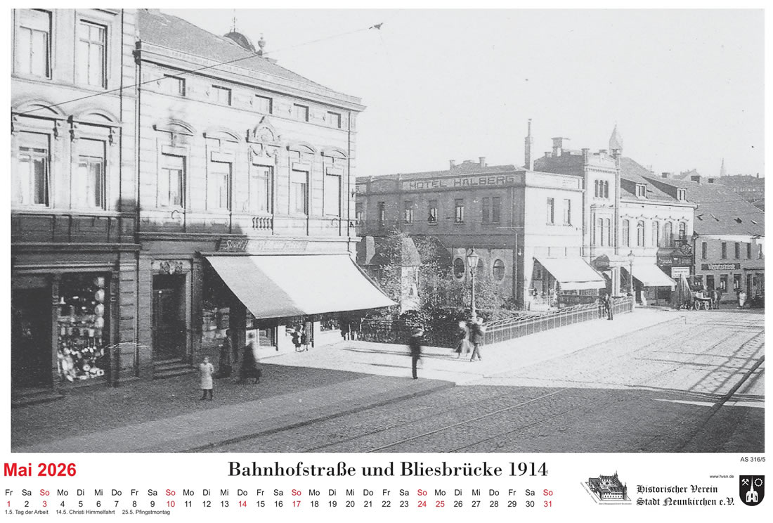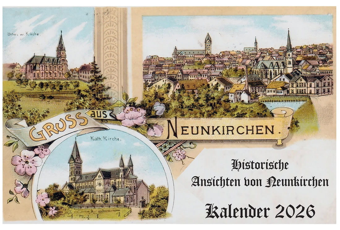 Auch für 2026 hat der Historische Verein Stadt Neunkirchen e. V. (HVSN) wieder einen Wandkalender mit 13 seltenen historischen Ansichten unserer Heimatstadt Neunkirchen im Format DIN A3 (quer) gestaltet. Großformatige Bilder erinnern an längst vergangene Zeiten. Der hochwertige Kalender zeigt jeden Monat eine andere historische Ansicht der Stadt Neunkirchen.